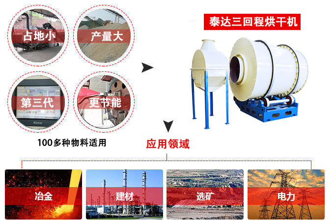 物料在烘干機(jī)內(nèi)走動三個回程,水分蒸發(fā)徹底,烘干成品均勻且質(zhì)量高,因為三回程結(jié)構(gòu),因此占地面積是長滾筒烘干機(jī)的1/3